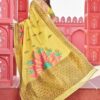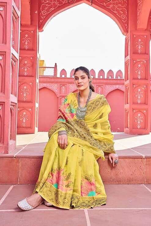 Moreover, the materials used in the Banarasi Patola Saree ensure a regal drape. While maintaining the necessary weight for a grand look, the textile utilizes high-quality silk blend threads that beautifully catch the light. Furthermore, the inclusion of dense Zari work—metallic threads woven throughout the geometric designs—enhances the festive and ceremonial appeal. This means the saree shimmers elegantly as the wearer moves, making it perfect for grand occasions like weddings and major festivals. You experience a garment that delivers the visual complexity of Patola along with the comfort and structure of a Banarasi brocade.
