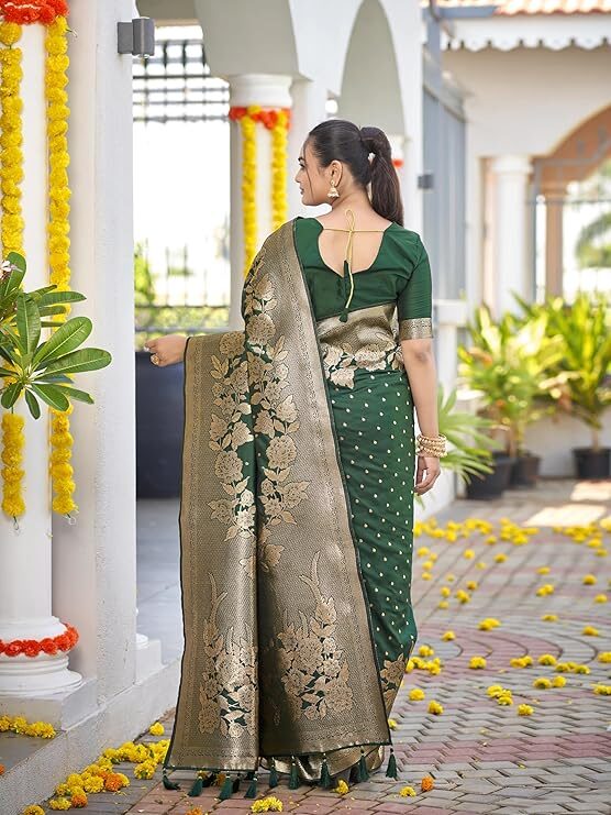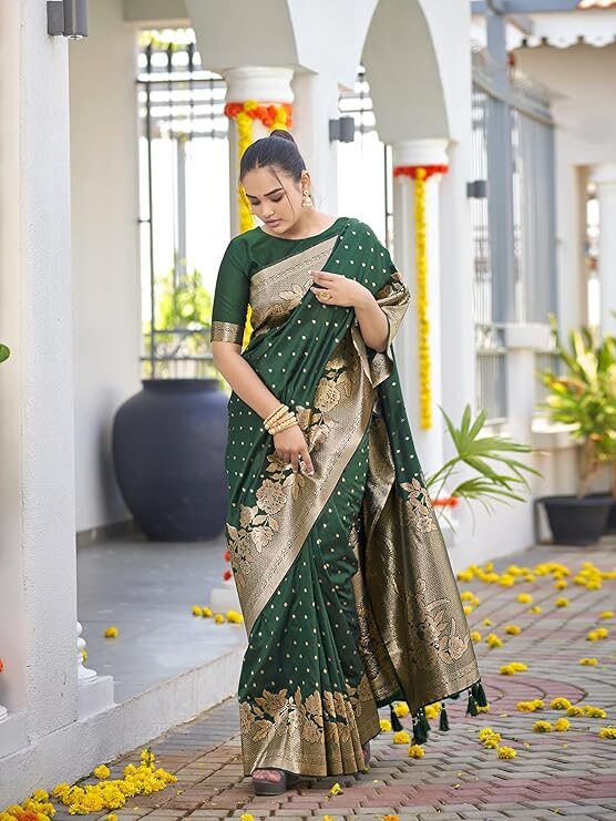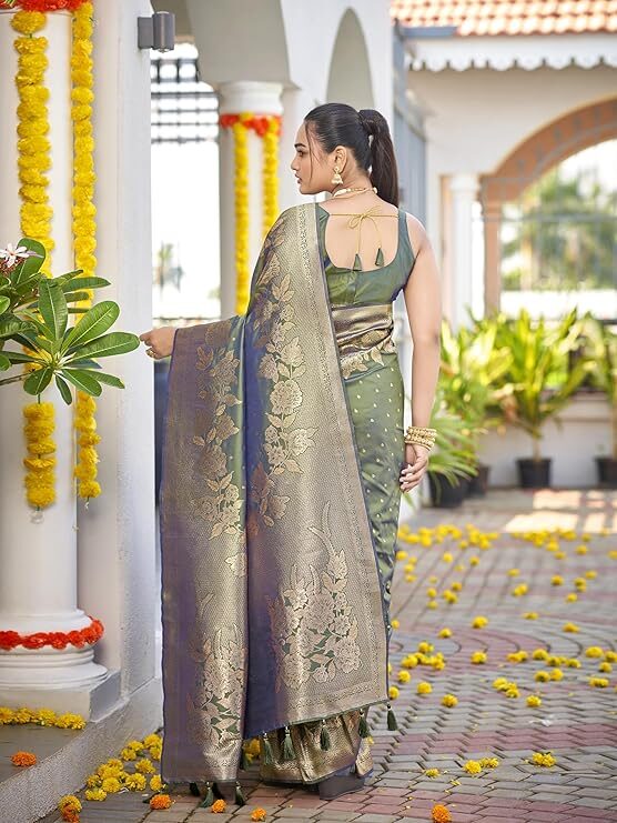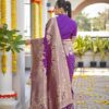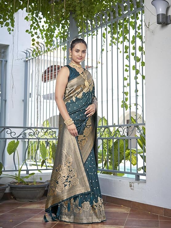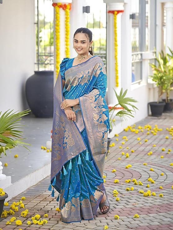 Finally, despite its ornate appearance, the Banarasi Woven Saree is built for permanence. Traditionally made from pure silk, or a high-quality silk blend, the durability of the weave ensures the saree retains its vibrant color and structured drape for generations. You can choose to pair the saree with the included unstitched blouse piece, customizing the fit to perfection. In summary, the Banarasi Woven Saree is a beautiful expression of heritage that empowers the woman who wears it with unmatched grace and confidence. Ultimately, this elegant design remains the gold standard for Indian celebration wear.
