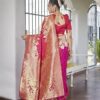 Firstly, the defining characteristic of a genuine Banarasi Saree is its complex woven detail. Master artisans employ specialized looms to integrate intricate motifs directly into the silk threads. Indeed, this heavy woven work often features stunning Zari—gold or silver metallic thread—that covers the surface. Therefore, the richness and depth of design are inherent to the fabric itself, not merely printed or embroidered on top. You observe classical patterns inspired by Mughal art, such as jaal (net) designs, floral butis, and stylized figures, which give the saree its signature regal aesthetic.
