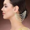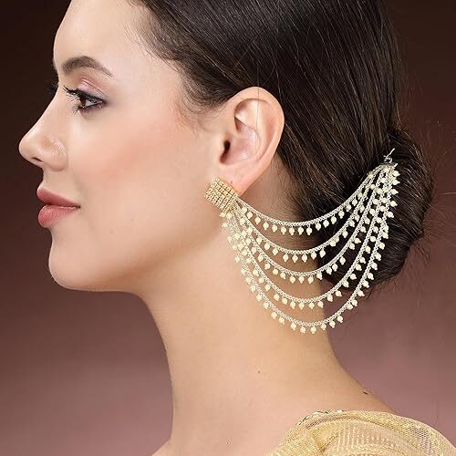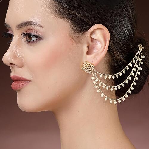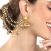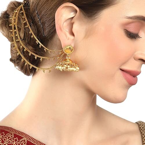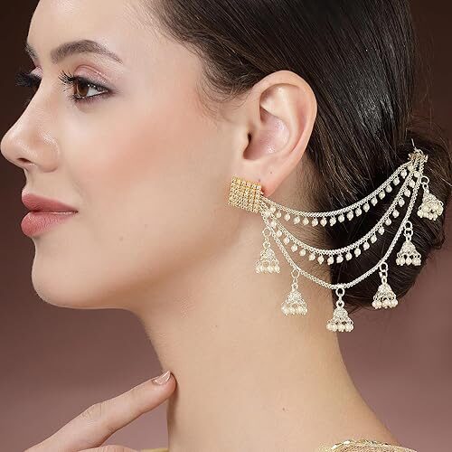 Today’s designs masterfully blend this historical opulence with modern wearability. Many stunning versions utilize Traditional Brass 18K Gold Plated finishing. This technique ensures a luxurious, high-carat look while keeping the overall piece lightweight and accessible. The bell-shaped jhumki retains its intricate detailing, now enhanced by delicate chains that drape elegantly toward the ear or hair, creating the illusion of a full ear cuff.