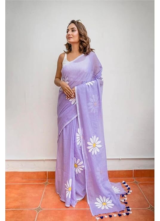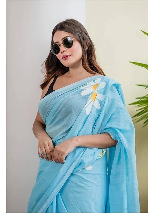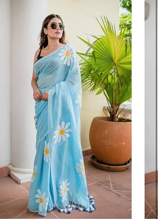 Styling this unique piece demands a minimalist approach to truly honor its delicate nature. Wearers typically pair the organza daisy print saree with a simple, contrasting blouse—perhaps a solid silk or a subtle sequence-worked piece—to ground the look. For accessories, opt for delicate jewelry. A simple diamond stud or a pearl choker perfectly complements the airy feel. In addition, choose lightweight footwear to maintain the ensemble’s graceful flow. Remember, this organza daisy print saree is a statement in itself, so keep everything else subdued.